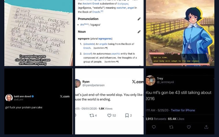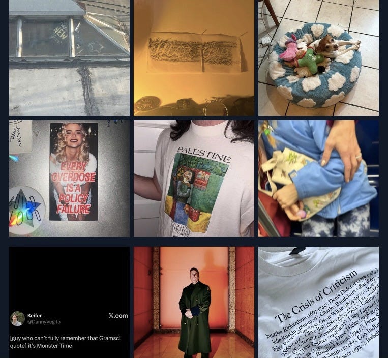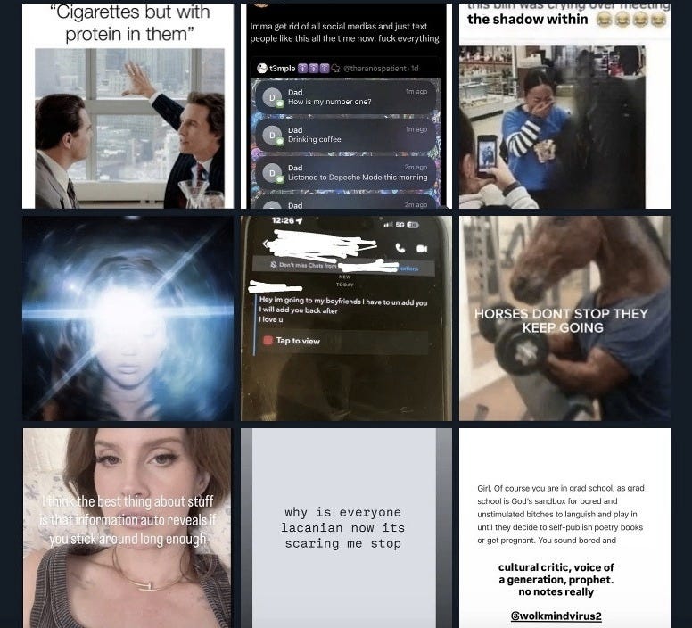 Wherever humans are, you’ll find the human desires there as well. And the thing about social media that everyone knows by now is the you’re often looking at the desire, the action the obtain the desired, the reality of having what you desire, and the feelings of unfulfilled hopelessness that can arise once you integrate the external object into your existence. We’ve gotten so good at the compounding we’ve started approaching the whole thing in the style of sideways in medias res, shortening that to “random”. But it also means we’re getting very good at telling a pretty emotionally and psychologically complex story in one image. Thousands of one image stories after the other. There is a science and an art to the bad crop, the typo, the pixelation, the messy editing since these are all signs of human life. The 3D shimmering through the 2D landscape. The one pair of natural teeth in the land of glow in the dark veneers. Recently, the tone has been a bit about escape and/or the way out being through but also the way out. Americans reaching the elder teen age of beginning to contemplate getting over themselves…we’ll fight about it first.