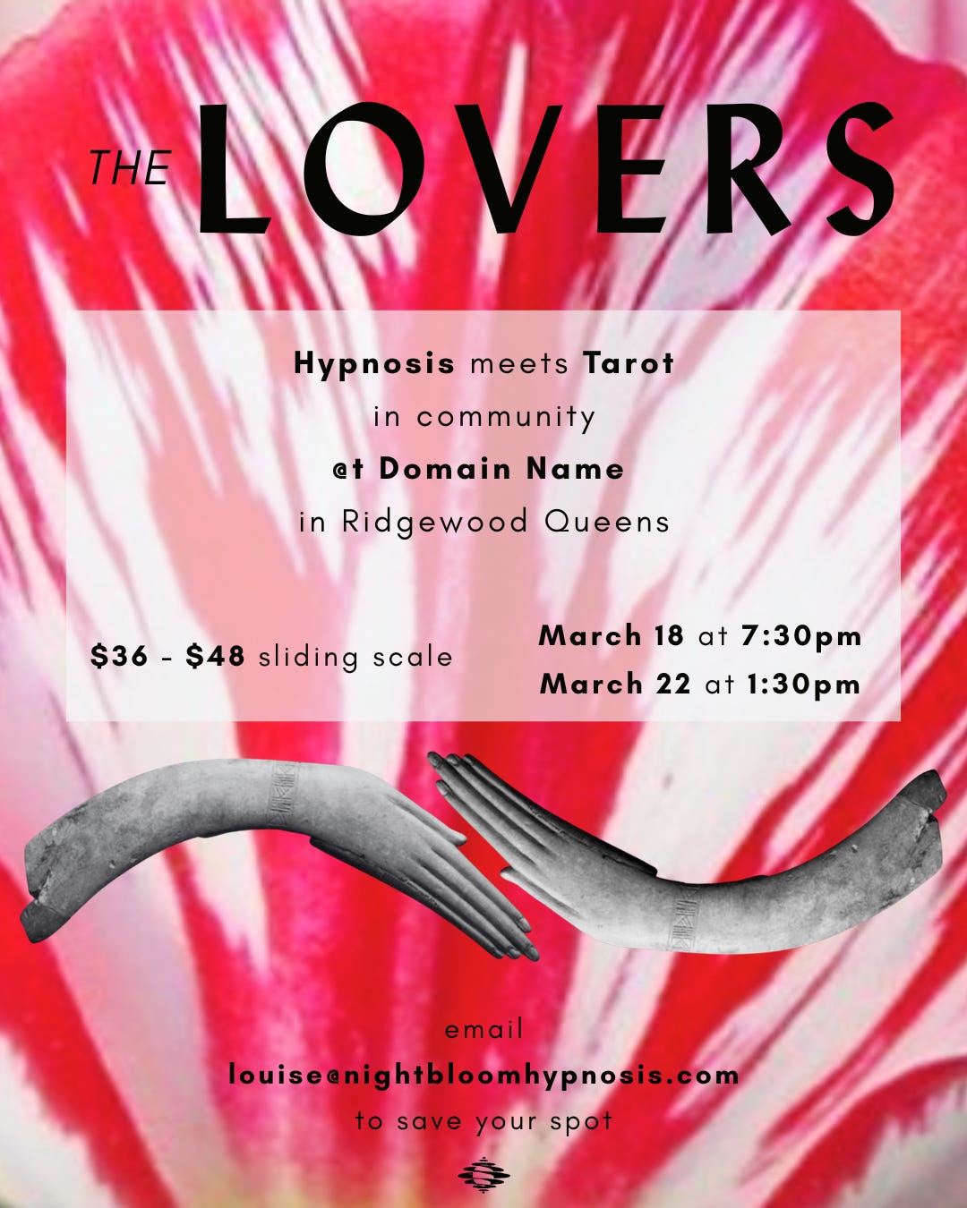 + A blend of Hypnosis & Tarot. Louise will guide small groups on a subconscious journey into the Tarot’s Major Arcana to absorb the lessons of each card. This month we’re exploring THE LOVERS - Arcana VI brings up questions around choice, desire, identity and pushes us to meet paradigm shifts with a loving embrace.